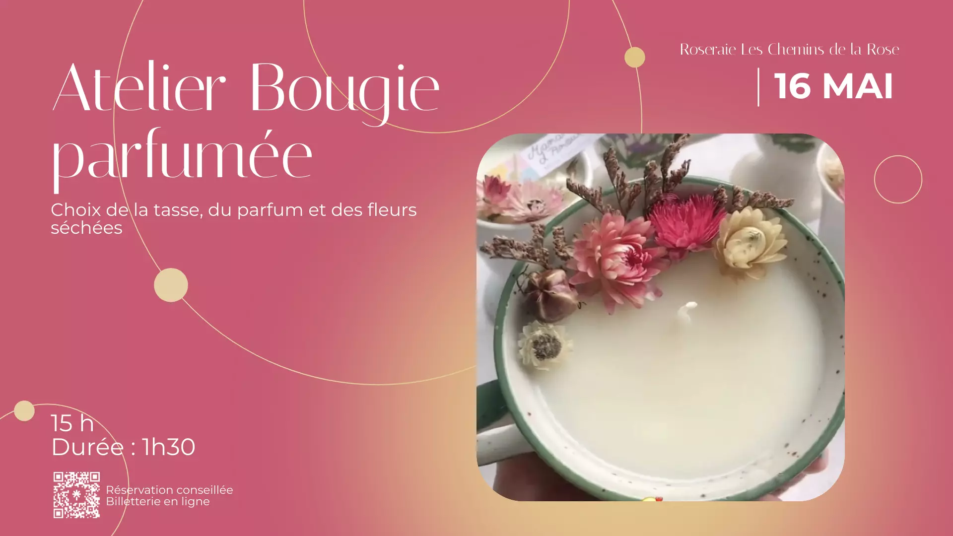 Samedi 16 mai 2026 de 15h à 16h30.1h30 d'atelier puis visite libre de la roseraie.