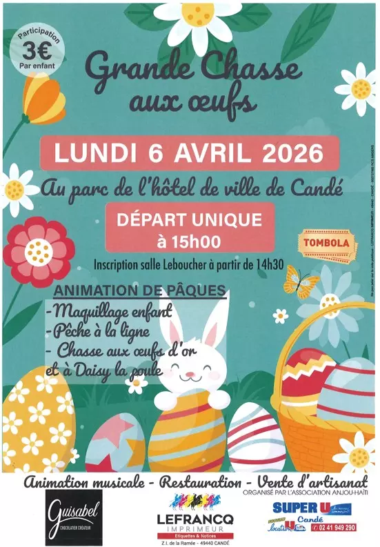 Chasse aux oeufs organisée le lundi 6 avril 2026 dans le parc de l'Hôtel de Ville de Candé.