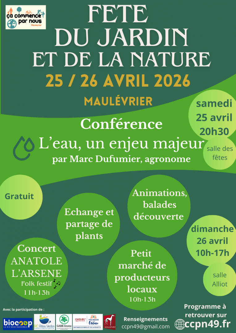 - le samedi 25 avril, à 20h30, soirée conférence par Marc Dufumier, agronome de renommée internationale, autour de la thématique de l'eau - salle des fêtes de Maulévrier