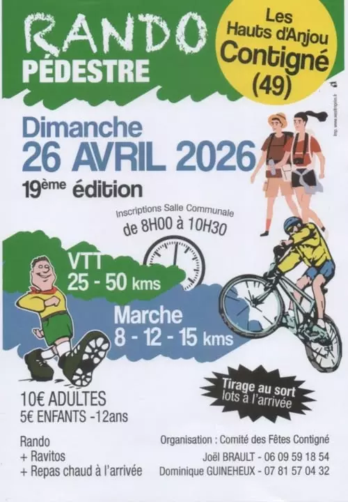 Randonnée pédestre organisée par le comité des Fêtes de Contigné le dimanche 26 avril 2026 à partir de 8h00 à Contigné au départ de la salle communale.