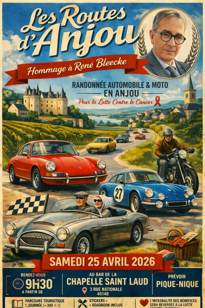 Organisée en hommage à René Bleecke, cette randonnée automobile et moto célèbre avant tout le plaisir de rouler ensemble, de découvrir et de partager. Au volant d’un véhicule de collection, d’exception ou au guidon d’une moto ancienne, laissez-vous porter par un parcours touristique soigneusement pensé, entre paysages angevins, villages de charme, patrimoine historique et haltes conviviales.