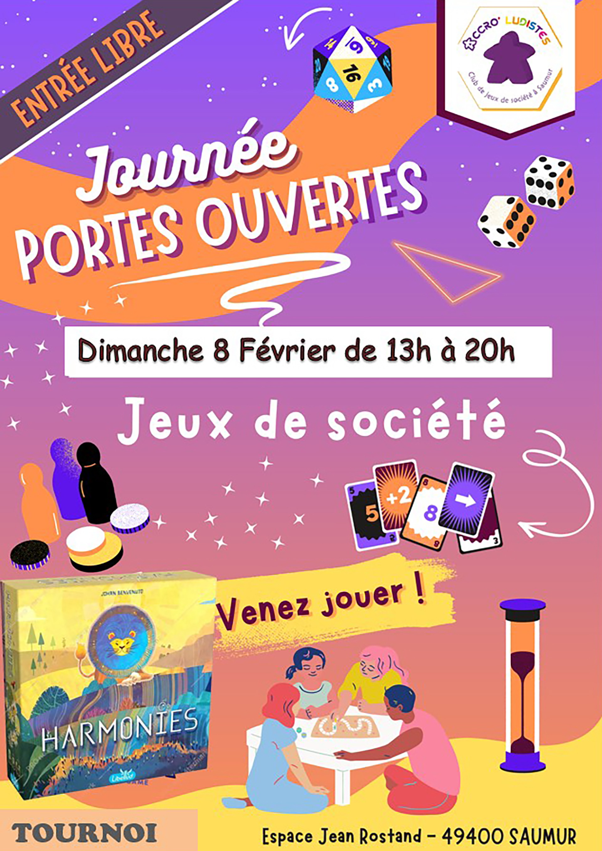 Les Accro’ludistes de Saumur ouvrent leurs portes ! Jeux de société pour tous et tournoi du jeu Harmonies sont au programme. Un après-midi ludique et convivial ouvert à tous !