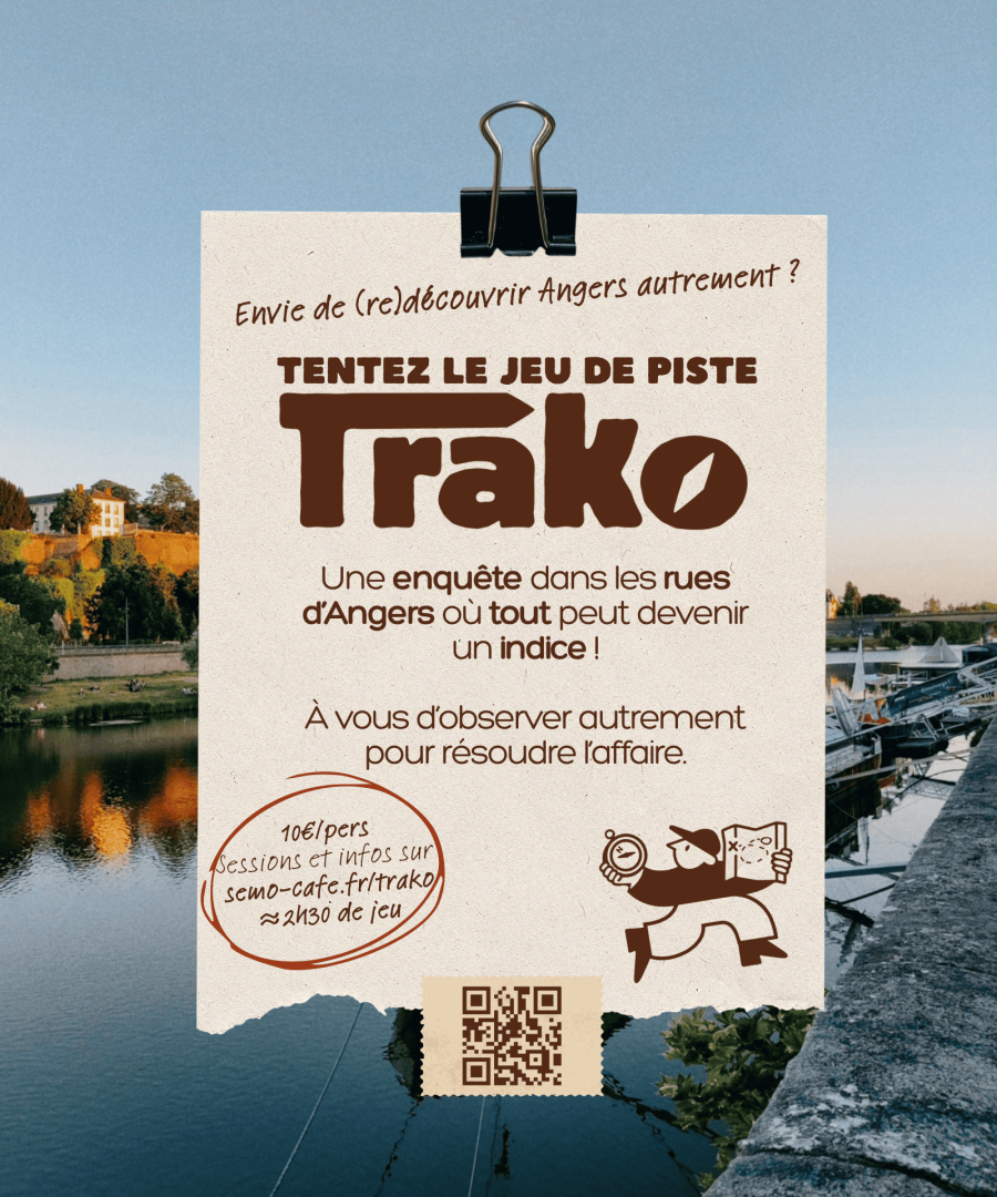 Trako, c’est une enquête grandeur nature où Angers devient votre terrain de jeu. Ouvrez l’œil, laissez de côté vos habitudes et apprenez à observer la ville autrement : chaque rue, chaque détail peut cacher un indice.