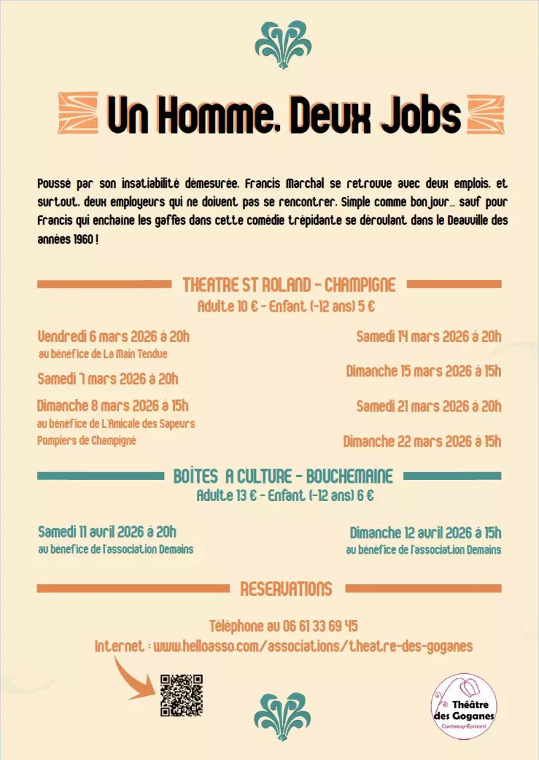 Le théâtre des Goganes et l'association Main Tendue de Champigné vous présentent leurs représentations de la pièce un homme, deux jobs, au Théâtre Saint-Roland à Champigné, les weekends du 06/07/08, 14/15, 21/22 mars ainsi que le weekend du 11/12 avril 2026..