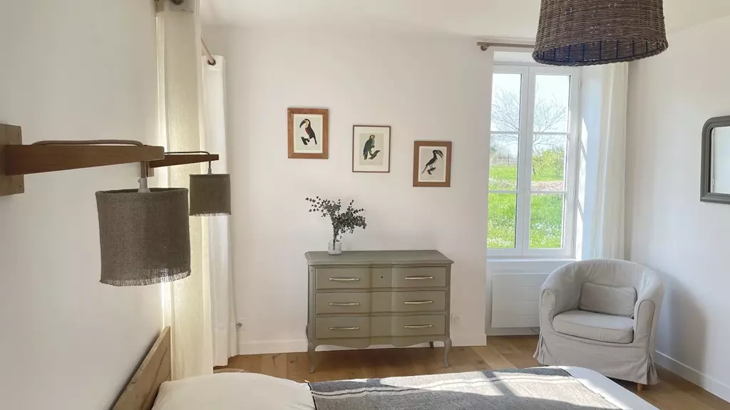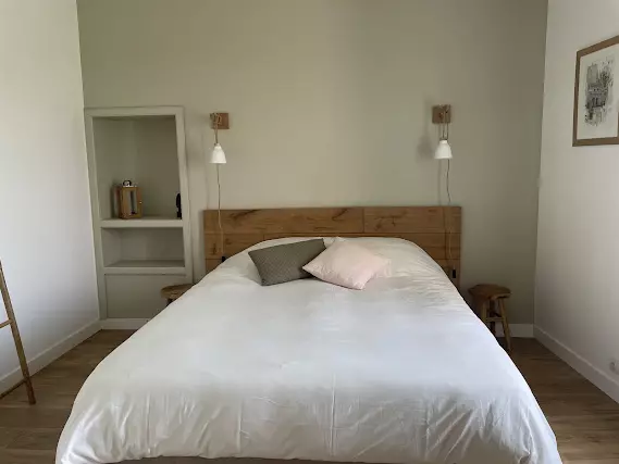 L'espace dédié aux voyageurs est indépendant du reste de la maison. Vous y trouverez deux chambres très lumineuses, donnant sur le jardin et le potager. Les ambiances y sont douces, avec une décoration épurée et des matériaux naturels. La première chambre, « Léon » est située au rez-de-chaussée. De 17m2, elle a un lit de 160 x 200, sa salle de bain et ses toilettes attenantes.