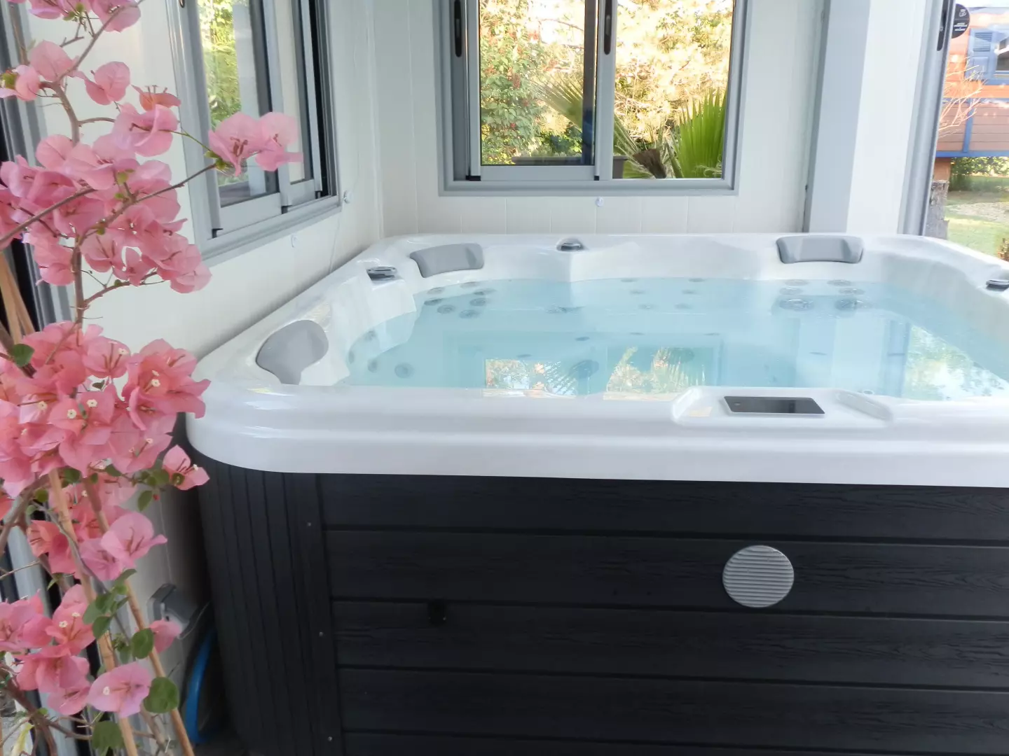 Entre sous-bois et vignes, dans le Parc Naturel Loire Anjou Touraine, la roulotte gîte est équipée haut de gamme avec piscine sécurisée, couverte et chauffée de mi-avril à fin septembre, traitée au sel, avec plages de relaxation, spa (en supplément).