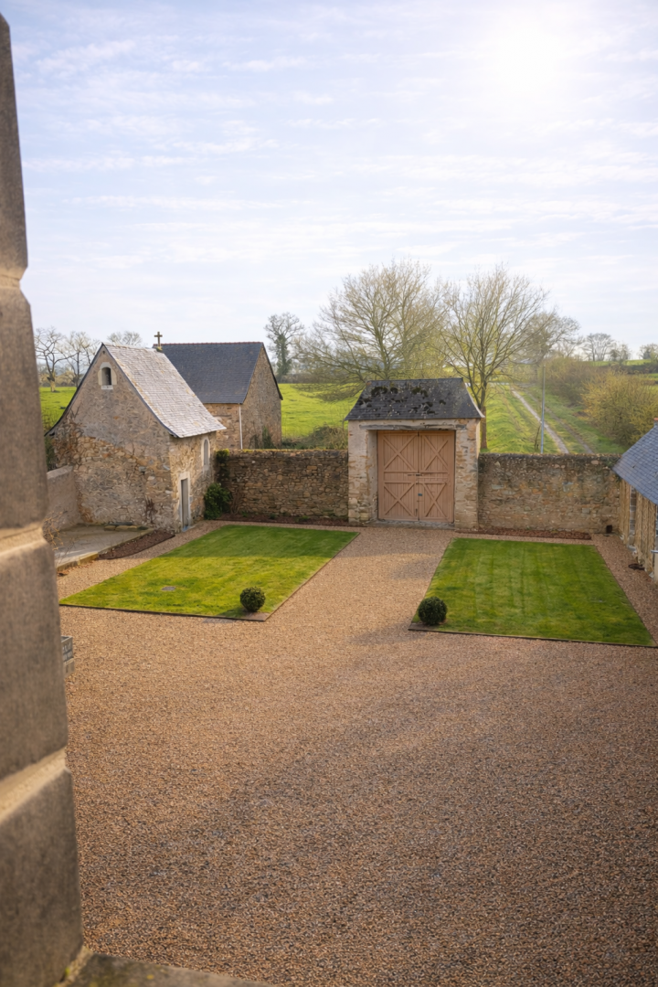 Le domaine possède également un jardin clos de murs en pierres sèches, organisé en six parterres réguliers plantés d’arbres fruitiers tels que pommiers, poiriers et cognassiers. Un puits occupe le fond du jardin, complétant cet ensemble patrimonial caractéristique des demeures rurales de l’Anjou.